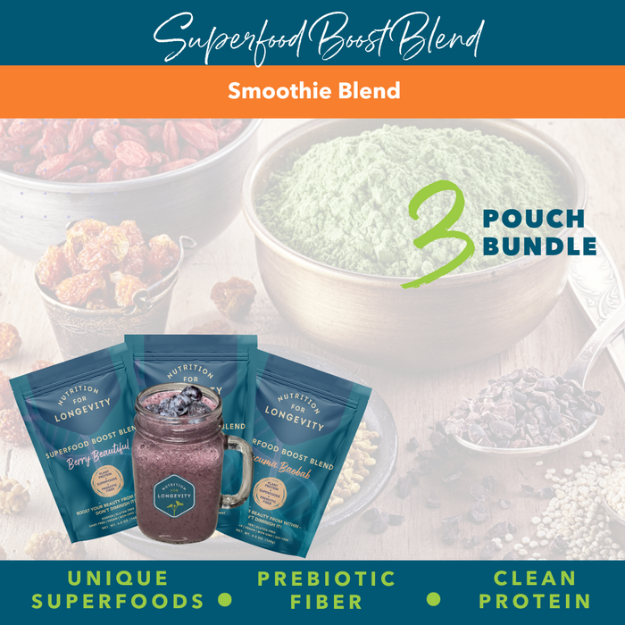 1. What you'll get: 3 pouches of our signature flavors of our Smoothie Boost Blends – Berry Beautiful, Lean Green, Lucuma Baobab